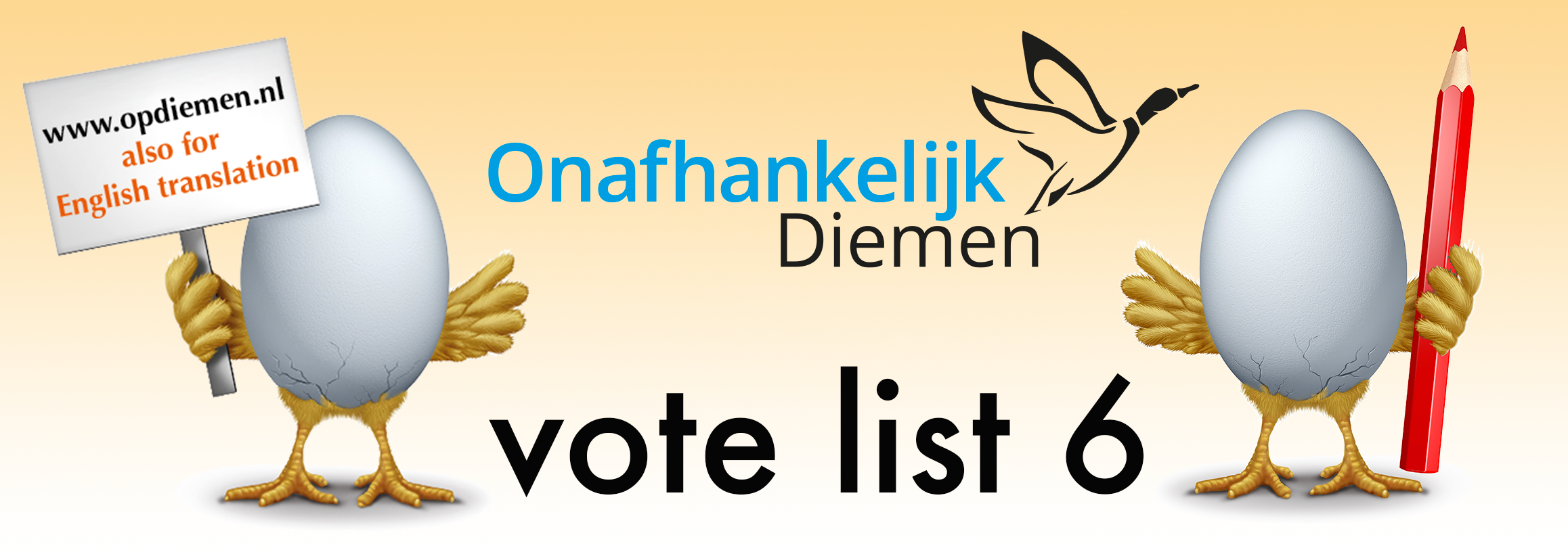 The task that the Independent Party Diemen sets itself is simple: to make and keep Diemen as livable as possible. That is an obligation, because every year a substantial amount of money goes from the citizen to the municipality of Diemen. The citizens of Diemen finance the municipality in this way and can expect quality in return for their money. The Independent Party Diemen will monitor the quality and the returns of the expenditure. A local party must form the basis of the municipal council. The old-fashioned struggle between left and right from the sixties is still around in Diemen. Local topics are pushed out of the news by national squabbles. There is only one interest for the Independent Party Diemen: that of the citizens of Diemen.
